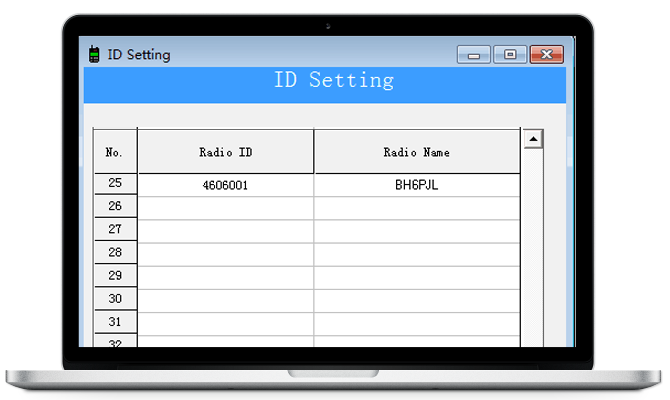 You can set lots of different ID. You can save all your IDs and select the one you need to use, don't need to edit it every time. And you can add, edit, delete them via radio keypad.