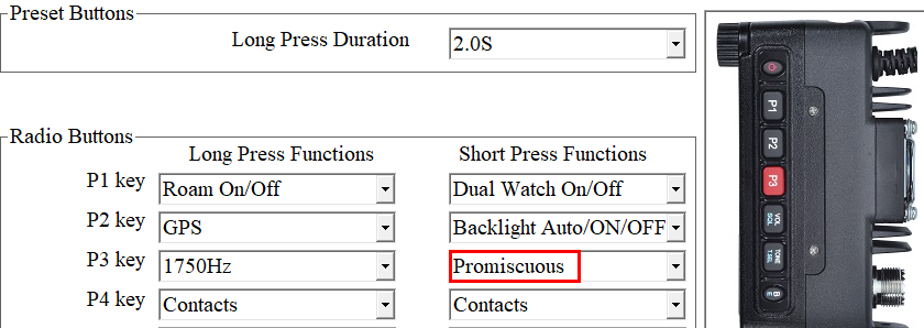 3. As well know, the normall function for promiscuous is to monitor different talkgroups, but here you can monitor different color codes. On RT73, only set a Custom key to "Promiscuous" function.