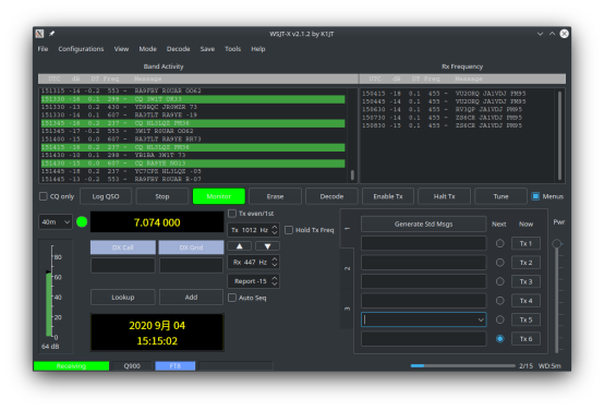 iv. Go back to the main wsjtx page and check whether the signal at the lower left corner is greater than 30dB and whether there is a signal in the waterfall chart.