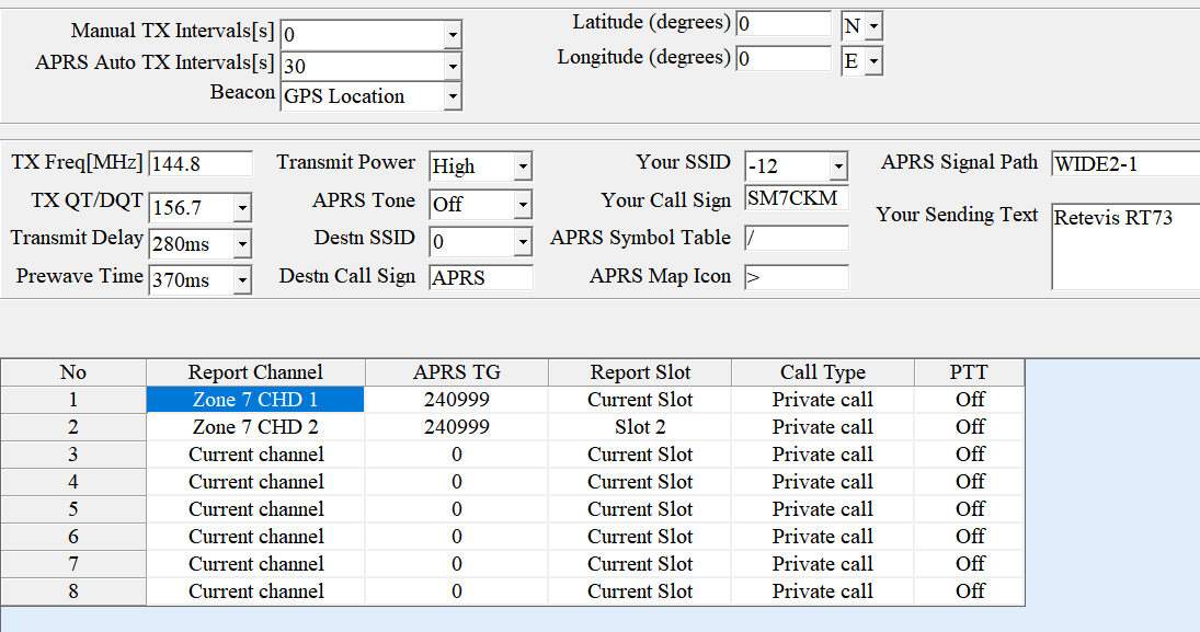 Manual Tx Intervals: RT73 can transmit APRS packets periodically at a selected interval, which is set here. it can acttach packets manually each time you press PTT. inside the APRS package will contain the text specified in the field and coordinates.