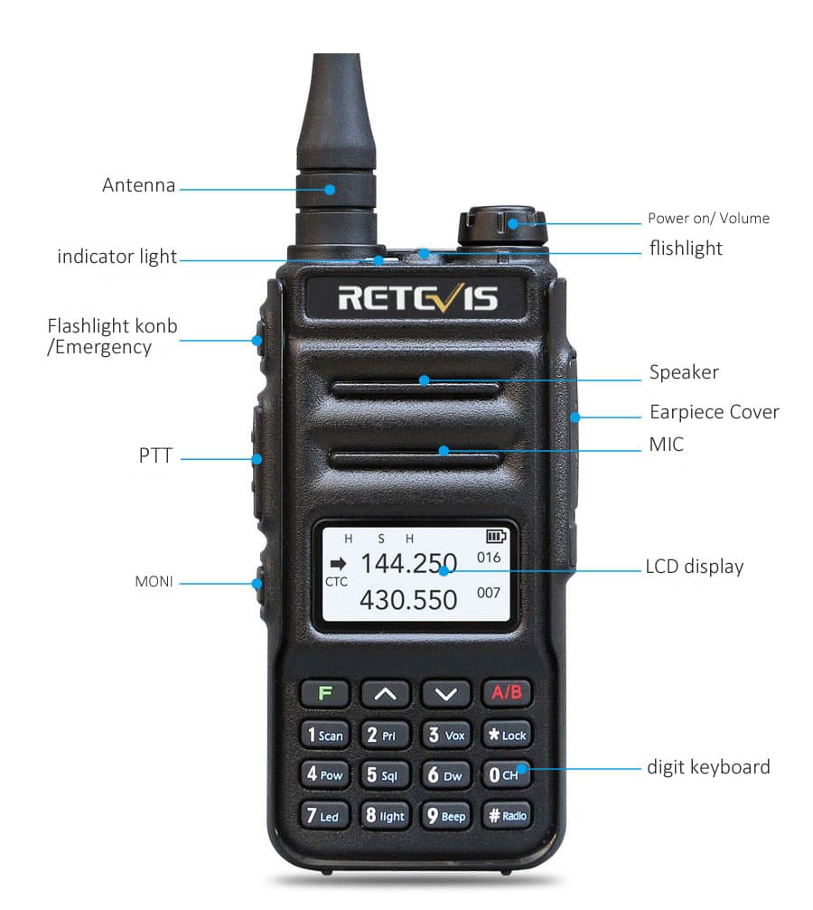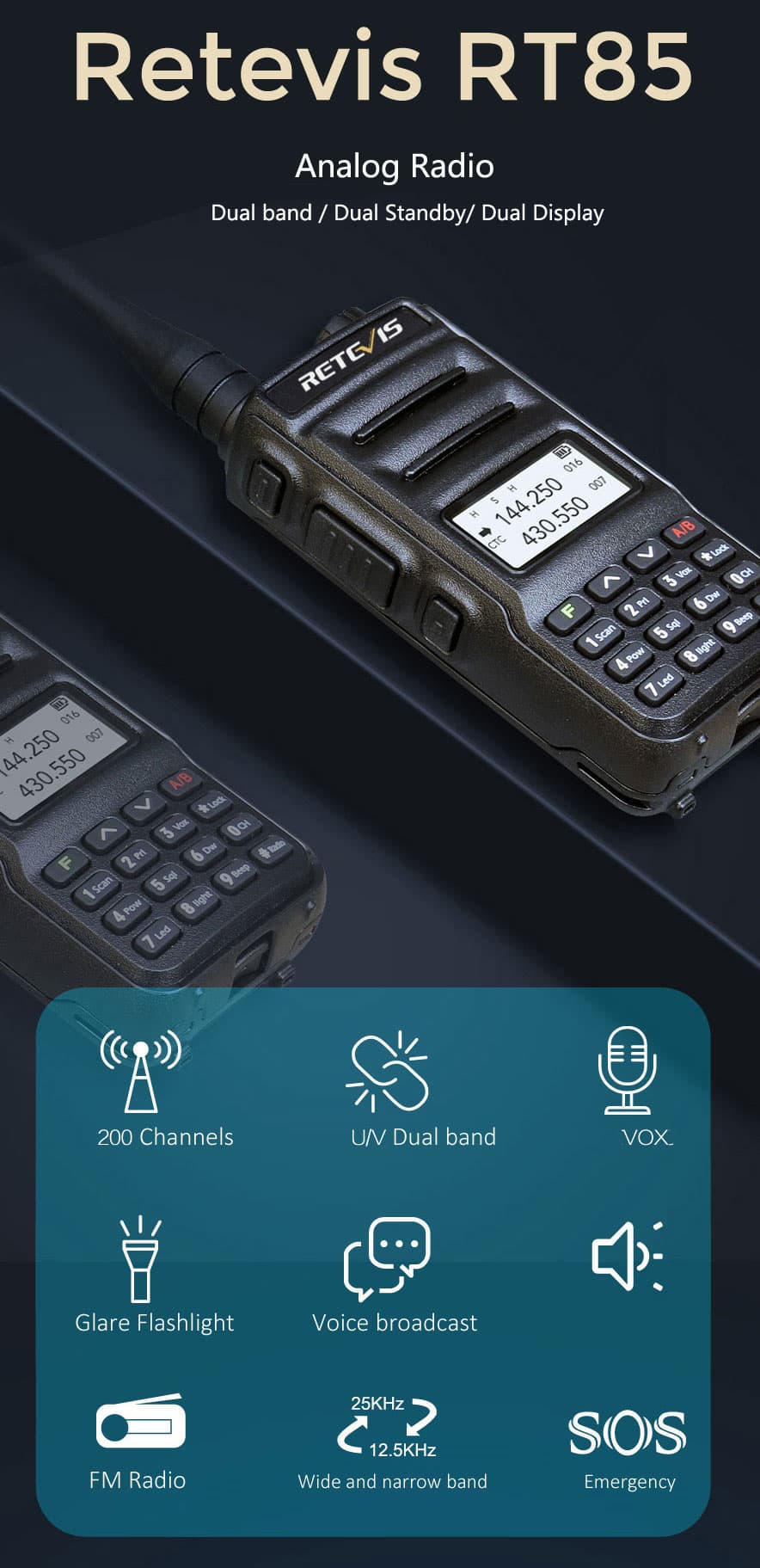 Retevis RT85 is an analog radio which comes with emergency alarm function. Its frequency range is VHF 136-174Mhz and UHF 400-470Mhz. For the first time use full dot matrix screen, the power frequency, channel and status indicators can be seen clearly. It can be dual standby and dual watch. Full keyboard operation, you can turn the knob or keyboard to unput the frequency what you want, and store 200 memory channels. With intelligent noise reduction technology.It also has a flashlight, which is convenient for outdoor camping and other dark environments.