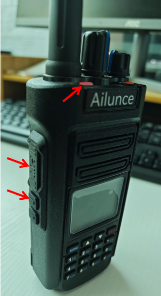 Press PTT+ Side Key 1, then rotate the power knob counterclockwise.