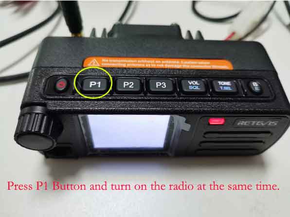 3. Enter RT73 DFU mode. Press the P1 button, and turn on the radio at the same time..