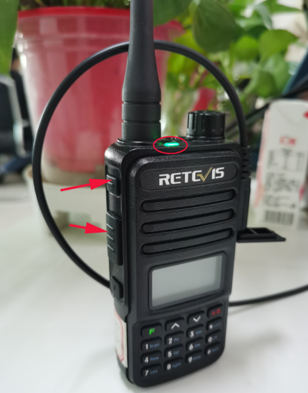 1. Enter the DFU mode. Press the PTT+P1 key together, turn on the radio.
