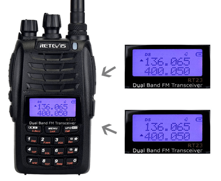 RT23 is not same with other radios. Other radios can “watch” two channels. Mointor two different frequencies(even on different bands (VHF/UHF)) and the radio will monitor both frequencies giving priority to the first station to receive an incoming call.RT23 not only can “watch” both frequencies, but also can receive two incoming calls at the same time. What is more,you can set the volume mode by the menu 35. MAIN indicates the main frequency sound is louder when receiving, SUB is indicates the sub frequency sound is lounder when receiving. OFF indicates both main and sub frequency have same sound.